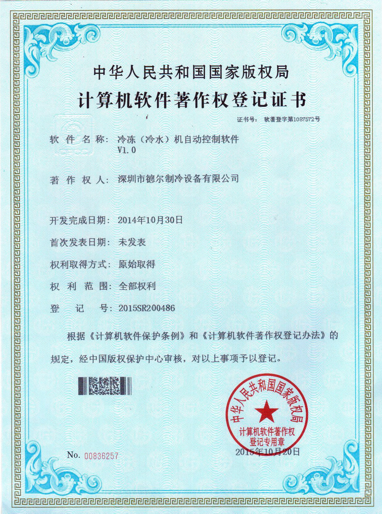 冷凍(冷水)機自動控制系統 軟件著作權證書