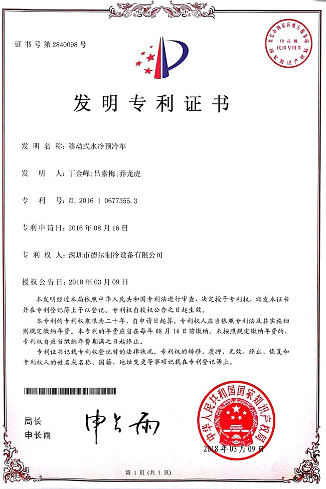 移動式水冷預冷冷車 發明證書
